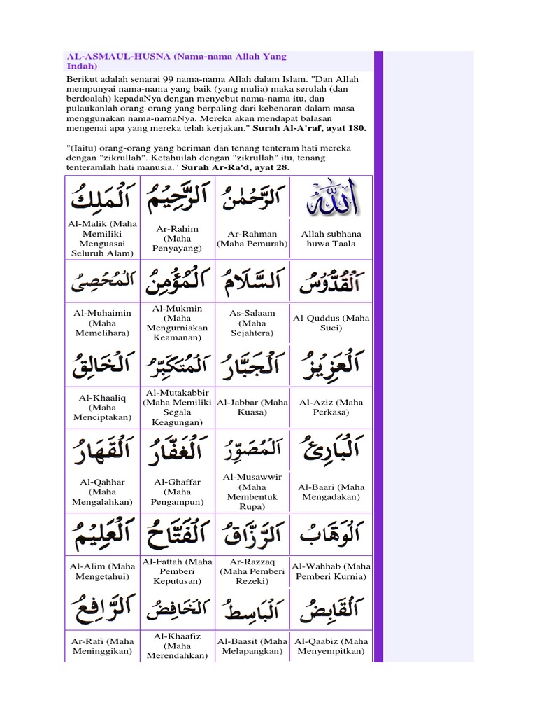 Posted by adieha @ 12:00 pm. For more information and source, see on this link : Dalam artikel ini, sy menyenaraikan secara lengkap nama nama allah (asmaul husna), sifat wajib allah, sifat mustahil dan fadhilat mengamalkan zikir asmaul husna. ( الله ) lafaz yang maha mulia yang merupakan nama dari zat ilahi yang maha suci serta wajib adanya yang berhak memiliki semua macam pujian dan sanjungan. | smule social singing karaoke app Sayyidul istighfar july (21) june (11) february (2) january (2) Doa asma ul husna 99 nama nama allah. Hadiah pengajian anak selangor latihan bahasa melayu tahun 6 2017 education gap in malaysia cara tentukan arah kiblat jumlah penduduk di malaysia apa itu bank draft biro pengawalan farmaseutikal kebangsaan ikea annual report 2017. For more information and source, see on this link : Asmaul husna dalam islam, asmaul husna adalah sembilan puluh sembilan (99) asma (nama) allah swt yang terbaik. Asmaul husna dalam tulisan rumi. Asmaul husna 99 nama allah allah nama. Bacaan ayat hendaklah dituturkan bersama pembaca al quran/ media mp3) bismilla hirrahma nirrahim tabb batt ya.